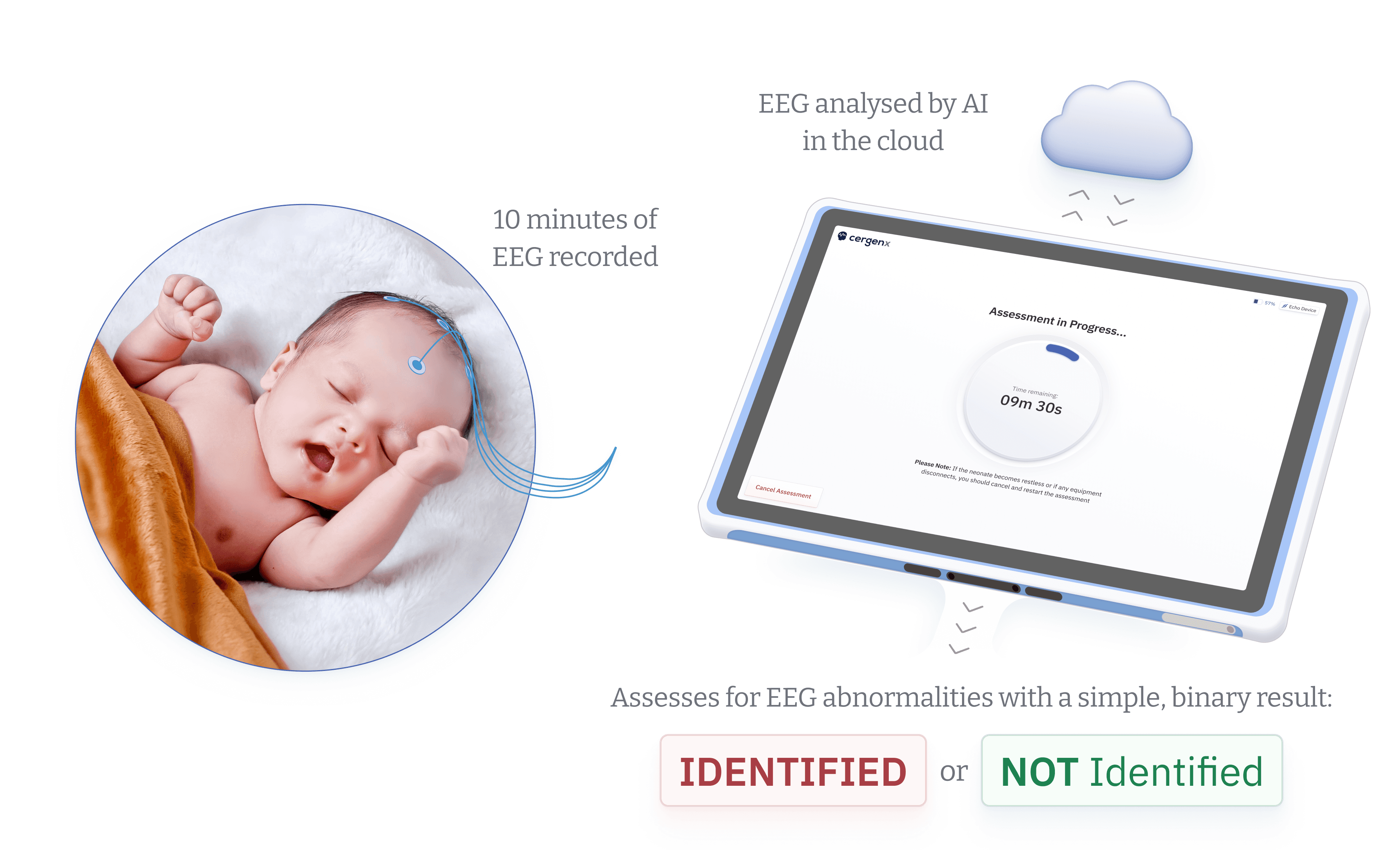 Patterns in the EEG provide real-time information about brain function and identify babies at risk of brain injury quickly. However, recording a clinical EEG is expensive, time consuming, and requires expert interpretation.⁴ It is generally only available in specialist centres. As a result, many newborns are currently not assessed at birth, missing critical opportunities for early intervention and treatment.